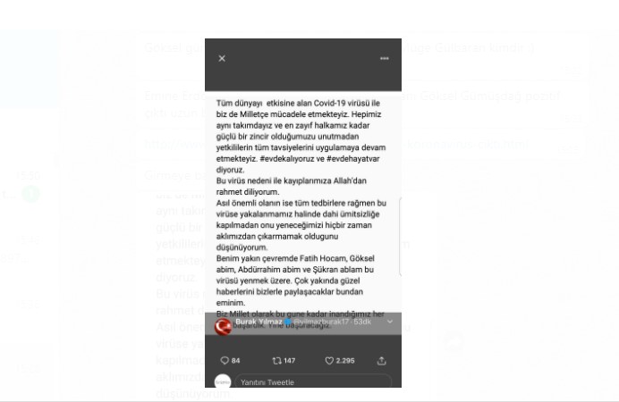 Göksel Gümüşdağ iki gün önce şu açıklamayı yapmıştı “Değerli dostum Fatih Terim’in koronavirüs test sonuçlarının pozitif çıktığını üzüntüyle öğrenmiş bulunmaktayım. Kıymetli dostuma geçmiş olsun diyor, en kısa sürede sağlığına kavuşmasını diliyorum.“