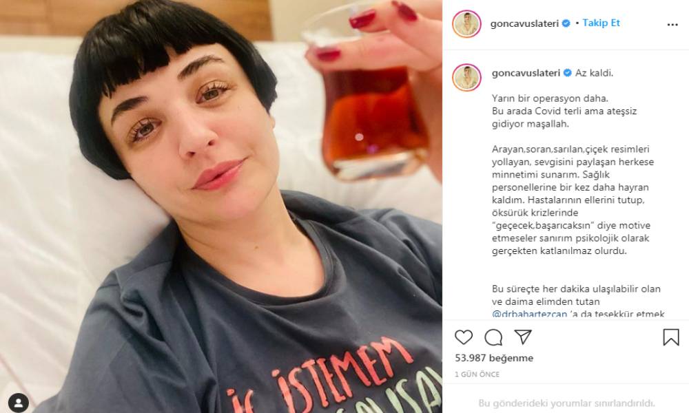 "Az kaldı... Yarın bir operasyon daha... Bu arada Covid terli ama ateşsiz gidiyor maşallah. Arayan, soran, sarılan, çiçek resimleri yollayan, sevgisini paylaşan herkese minnetimi sunarım. Sağlık personellerine bir kez daha hayran kaldım. Hastalarının ellerini tutup, öksürük krizlerinde 'Geçecek, başaracaksın' diye motive etmeseler sanırım psikolojik olarak gerçekten katlanılmaz olurdu. Bu süreçte her dakika ulaşılabilir olan ve daima elimden tutan doktoruma da teşekkür etmek istiyorum" dedi.