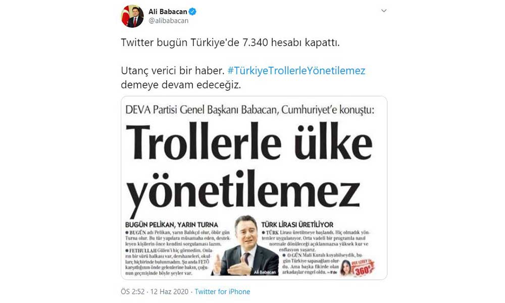 Twitter manipülasyon yapıldığı gerekçesiyle AKP'li 7 bin 340 hesabı kapattığını duyurdu. Yapılan açıklamada, bu yılın başlarında Türkiye içindeki kullanıcıları hedef alan ve koordineli bir şekilde sahte faaliyetlerde bulunan kullanıcı ağının tespit edildiği belirtilerek, “Bu ağın teknik göstergeleri ve davranışları hakkında yaptığımız analiz neticesinde sahte ve ele geçirilmiş hesapların AKP lehine siyasi söylemlerin yayılması ve Cumhurbaşkanı Erdoğan için güçlü destek sergilediği görüldü. Bugün 7 bin 340 hesabı arşive ifşa ediyoruz” denildi. https://tele1.com.tr/twitter-acikladi-akpyle-baglantili-7-bin-340-troll-hesap-kapatildi-175549/ DEVA Partisi Genel Başkanı Ali Babacan olayı "utanç verici" olarak yorumladı. Babacan, sosyal medya hesabı Twitter'dan yaptığı açıklamada, "Twitter bugün Türkiye'de 7.340 hesabı kapattı.Utanç verici bir haber. #TürkiyeTrollerleYönetilemez demeye devam edeceğiz" ifadelerini kullandı. https://tele1.com.tr/hesaplari-kapatilan-aktrollere-saray-sahip-cikti-175747/ İşte Babacan'ın o paylaşımı: