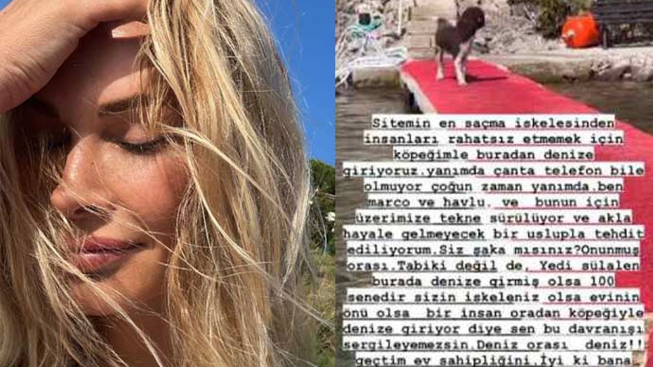 “İfademi olaydan hemen sonra verdim. Polis arkadaşlarımız hemen müdahale ettiler, ifadesi alındı ya da alınacak. Şu an kimlerle aynı ortamda yaşadığımızı sindirmeye çalışıyorum. Sizin gibi insanların çocukluk travmalarını Ben çekmeyeceğim. Sen tedavi olacaksın ya da topluma karışmayacaksın… Sitemin en saçma iskelesinden insanları rahatsız etmemek için köpeğimle buradan denize giriyoruz. Yanımda çanta, telefon bile olmuyor çoğu zaman… Yanımda Marco ve havlu… Ve bunun için üzerimize tekne sürülüyor ve akla hayale gelmeyecek bir üslupla tehdit ediliyorum. Siz şaka mısınız? Onunmuş orası… Tabii ki değil de yedi sülalen burada denize girmiş olsa, 100 senedir sizin iskeleniz olsa, evinin önü olsa bir insan oradan köpeğiyle denize giriyor diye sen bu davranış sergileyemezsin… Deniz orası deniz… Geçtim ev sahipliğini… İyi ki bana denk geldiniz… Ben sonuna kadar gideceğim bu meselenin…”