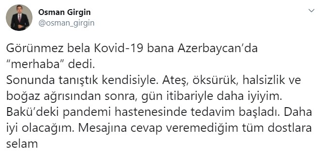 Bir süredir Azerbaycan-Ermenistan çatışmasını takip için Azerbaycan’da olan Haber Global spikeri Osman Girgin, koronavirüse yakalandığını Twitter’dan açıkladı.