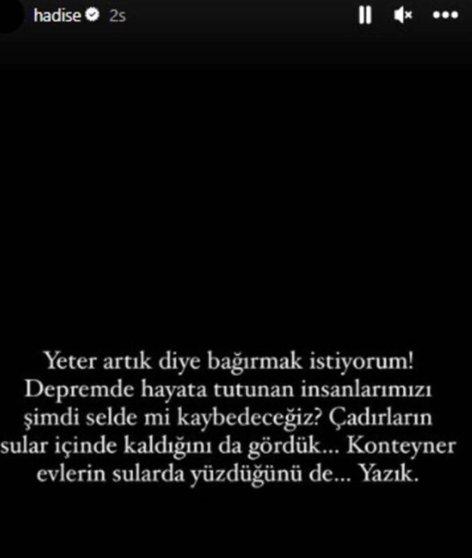 Şarkıcı, Instagram hesabından şunları yazdı: "Yeter artık diye bağırmak istiyorum! Depremde hayata tutulan insanlarımızı şimdi selde mi kaybedeceğiz? Çadırların sular içinde kaldığını da gördük. Konteyner evlerin sular içinde yüzdüğünü de. Yazık."