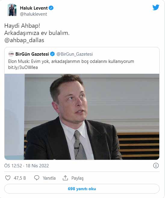 Haluk Levent, paylaşımında Musk'ın açıklamasına dair bir haberi alıntılayarak, "Haydi Ahbap! Arkadaşımıza ev bulalım. @ahbap_dallas" yazdı.