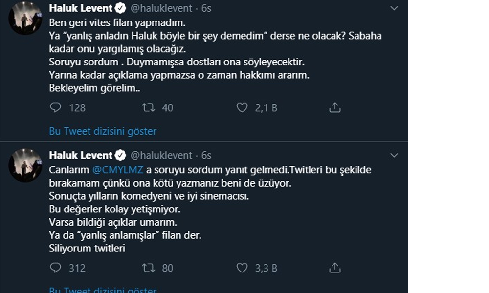 Yaşananlarla ilgili sosyal medyadan bir açıklama yapan Haluk Levent, “Sevgili @CMYLMZ. Hepimiz seni çok seviyoruz. 3 ayrı kişi yanlış duymuş olabilir mi? Yanlış oyunu izlemişlerse özür dilerim. Değilse lütfen ‘yakında’ olmadan şimdi tüm ülkeye açıklar mısın ‘vurgun’u? 1 tl’lik var ise şerefim üzerine ülkeyi terk edeceğim. Lütfen yazar mısın”