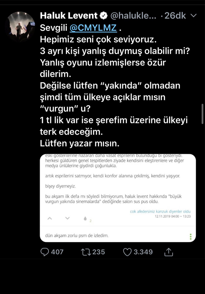 Yaşananlarla ilgili sosyal medyadan bir açıklama yapan Haluk Levent, “Sevgili @CMYLMZ. Hepimiz seni çok seviyoruz. 3 ayrı kişi yanlış duymuş olabilir mi? Yanlış oyunu izlemişlerse özür dilerim. Değilse lütfen ‘yakında’ olmadan şimdi tüm ülkeye açıklar mısın ‘vurgun’u? 1 tl’lik var ise şerefim üzerine ülkeyi terk edeceğim. Lütfen yazar mısın”
