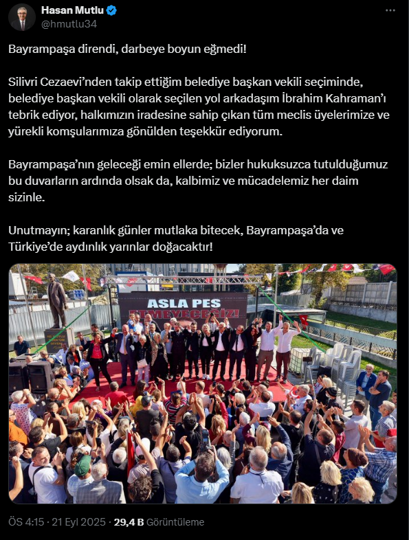 Silivri Marmara Cezaevi'nden seçimi takip ettiğini belirten tutuklu Bayrampaşa Belediye Başkanı Hasan Mutlu, "Bayrampaşa direndi, darbeye boyun eğmedi!" açıklamasını yaptı.
