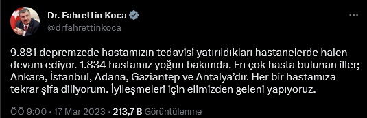 Sağlık Bakanı Fahrettin Koca, resmi verilere göre 48 binden fazla kişinin öldüğü deprem felaketinin ardından 9 bin 881 kişinin tedavisinin devam etiğini bildirdi. Koca, bin 834 kişinin de yoğun bakımda olduğunu belirtti.