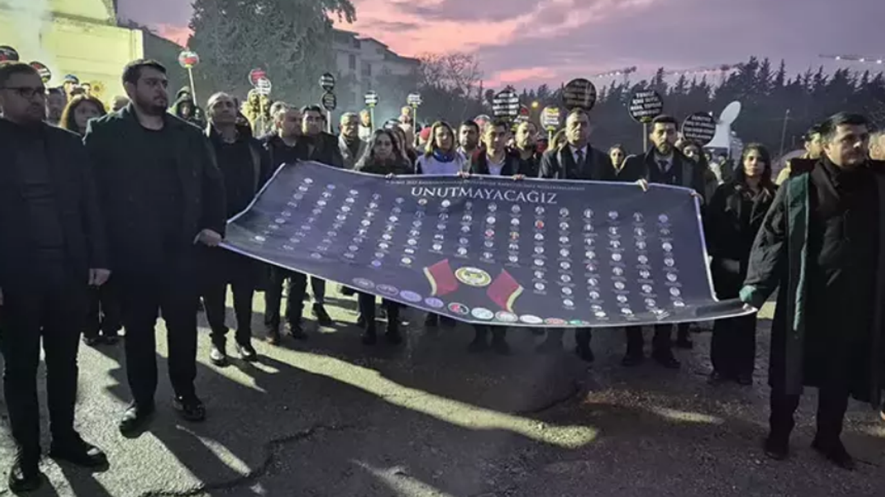 Kahramanmaraş merkezli 6 Şubat depremlerinde hayatını kaybeden avukatların isimlerinin yazılı olduğu pankartla toplanan Hatay Barosu üyesi avukatlar, sessiz yürüyüş yaptı.