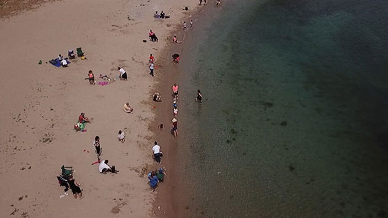 Fenerbahçe Sahili'nde aileleriyle birlikte dışarı çıkan ve denize giren çocuklar havadan görüntülendi.