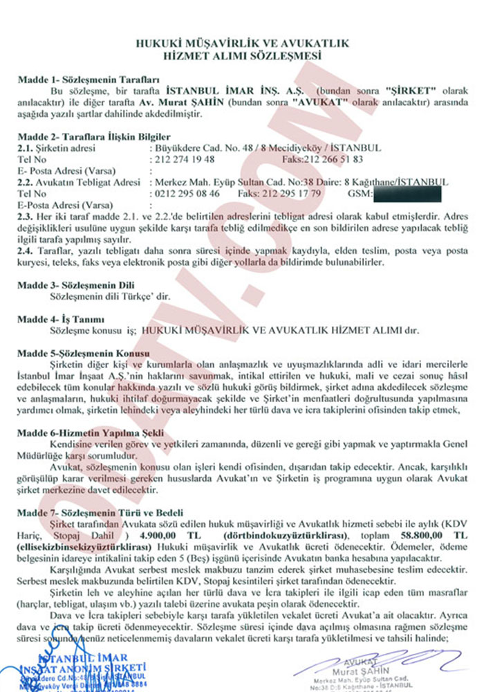 Sözleşmede, aylık 4 bin 900 TL olmak üzere toplam 58 bin 800 TL karşılğında İBB Meclis üyesi Avukat Murat Şahin’in İmar A.Ş’ye “avukatlık hizmeti” vereceği belirtildi.