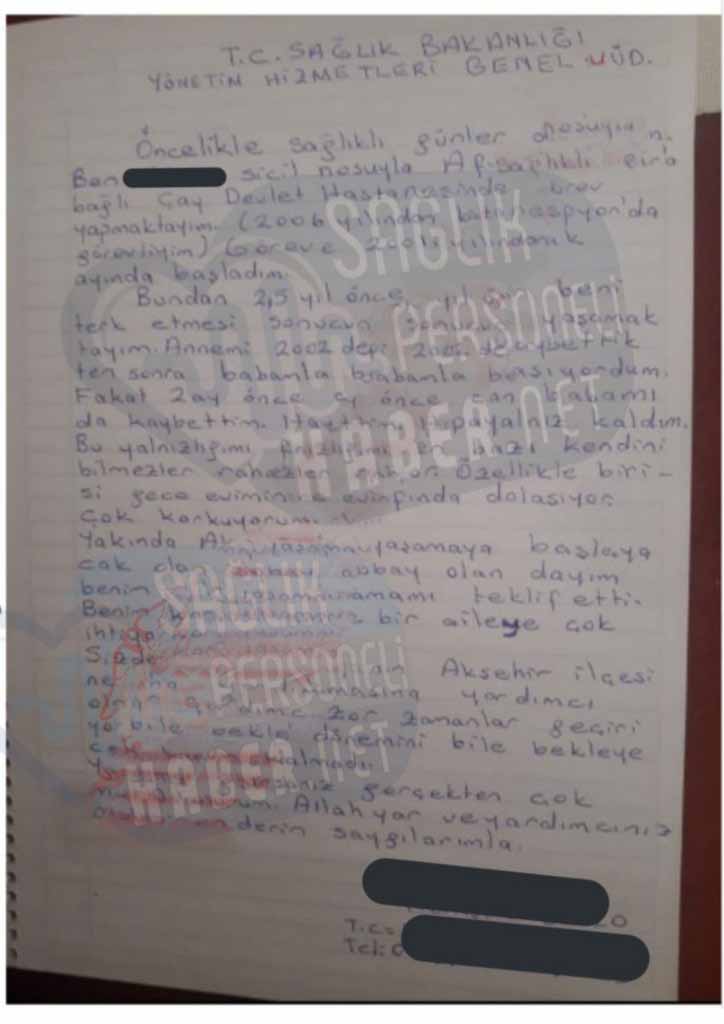 Yalnız yaşamasından dolayı rahatsız edildiğini ileri süren hemşire, geceleri evinin etrafında dolaşan biri olduğunu belirterek Sağlık Bakanlığı’na tayin talebinde bulundu. Yakın zaman içerisinde Konya’nın Akşehir ilçesinde yaşamaya başlayacak olan akrabasının yanına tayininin gerçekleştirilmesini talep eden hemşire, dilekçesinde şu ifadelere yer verdi: “Benim korunmaya ve bir aileye çok ihtiyacım var. Sizden ricam Konya’nın Akşehir ilçesine tayinimin çıkmasına yardımcı olmanız. O kadar zor zamanlar geçiriyorum ki tayin dönemini bile bekleyecek gücüm kalmadı”