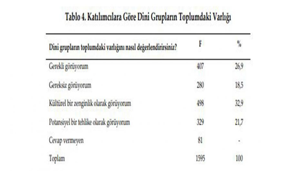 Çalışma, öğrencilerin yüzde 59,8'le yarısından fazlası, dini grupları "toplum için gerekli" ya da "kültürel bir zenginlik" olarak gördüğünü ifade ederken, “İslam toplumunda dini gruplara ihtiyaç yoktur” önermesine yüzde 51,4'lük bir kesimin katılmadığı ortaya çıktı.
