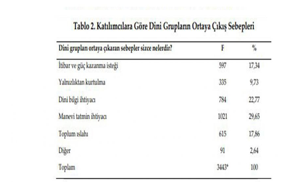 Benzer yöne işaret eden “toplum ıslahı” seçeneğini işaretleyenler de ilave edilince öğrencilerin yüzde 70,28', dini grupları var eden sebepleri toplumdaki dini ve manevi ihtiyaçlara bağladığı sonucuna ulaşıldı.