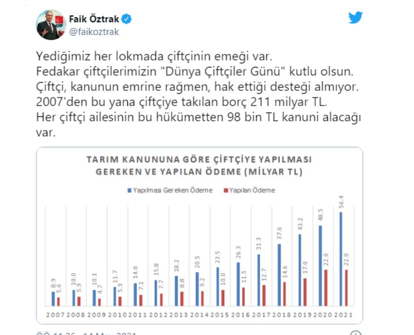 Öztrak "Yediğimiz her lokmada çiftçinin emeği var. Fedakar çiftçilerimizin "Dünya Çiftçiler Günü" kutlu olsun. Çiftçi, kanunun emrine rağmen, hak ettiği desteği almıyor. 2007'den bu yana çiftçiye takılan borç 211 milyar TL. Her çiftçi ailesinin bu hükümetten 98 bin TL kanuni alacağı var" ifadelerini kullandı.