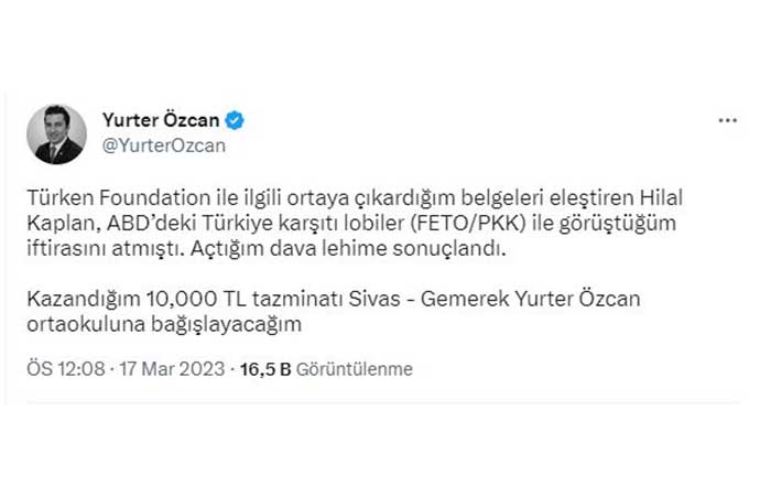Dava sonucu sosyal medyadan paylaşan Özcan "Türken Foundation ile ilgili ortaya çıkardığım belgeleri eleştiren Hilal Kaplan, ABD’deki Türkiye karşıtı lobiler (FETO/PKK) ile görüştüğüm iftirasını atmıştı. Açtığım dava lehime sonuçlandı. Kazandığım 10,000 TL tazminatı Sivas - Gemerek Yurter Özcan ortaokuluna bağışlayacağım." dedi.