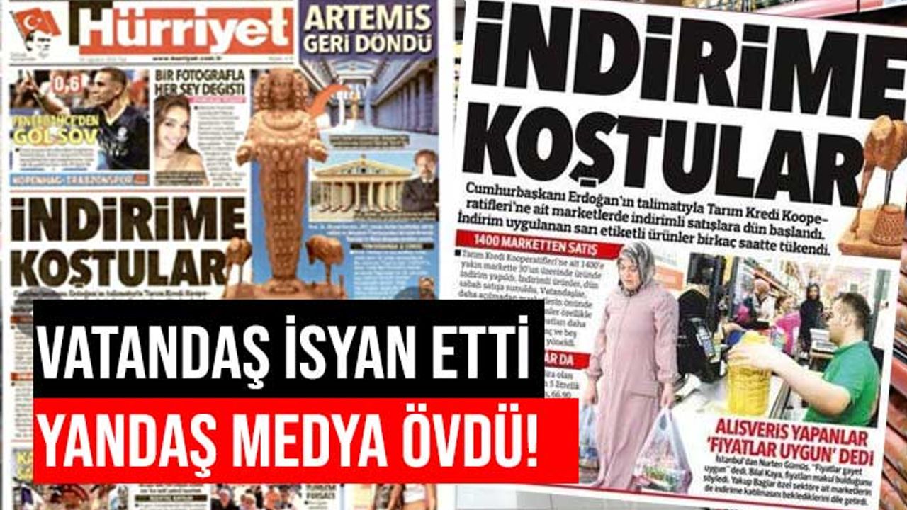 AKP’li Cumhurbaşkanı Recep Tayyip Erdoğan'ın Tarım Kredi Kooperatifi indirimlerini duyurmasının ardından vatandaşlar marketlere koştu, indirim göremeyip isyan etti. Hürriyet Gazetesi ise vatandaşların göremediği indirimi manşetine taşıdı.