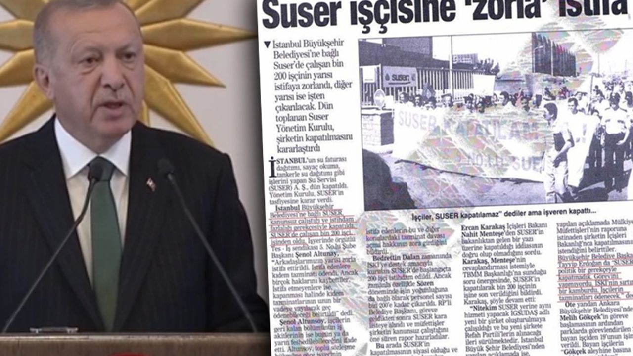 Büyükşehir belediye başkanlarıyla Beştepe’deki buluşmasında CHP'li başkanları hedef alarak başkan seçildiği dönemde “Çalışan, bulunduğu yeri hak eden hiç kimseye dokunmadık” iddiasında bulunan AKP'li Cumhurbaşkanı Erdoğan, İBB Başkanı seçildikten 5 ay sonra belediye iştiraki SUSER’i kapatarak bin 200 kişinin işsiz kalmasına neden olmuştu.