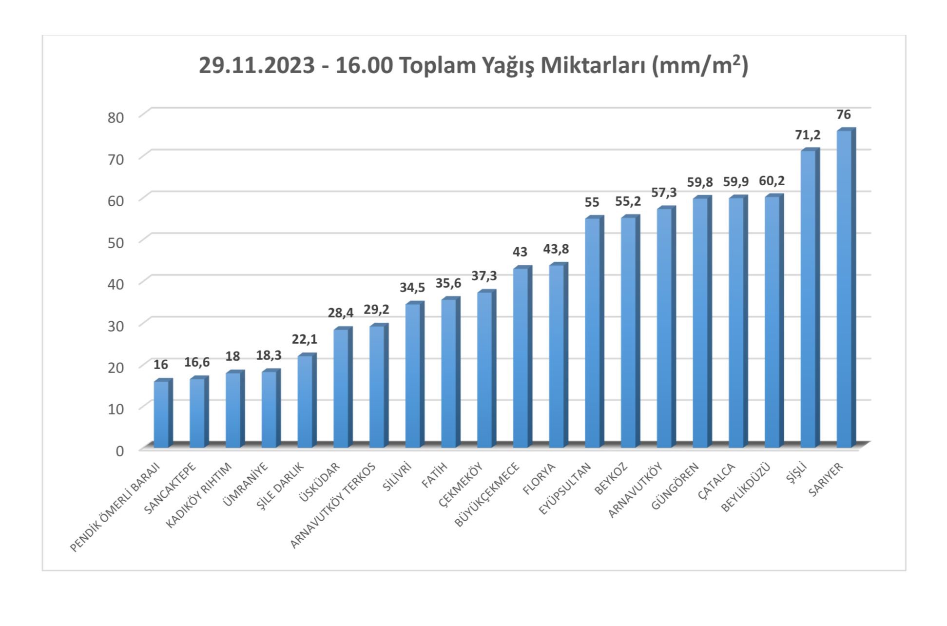 İstanbul'da öğle saatlerinde başlayıp akşam saatlerinde şiddetini arttıran yağış hayatı olumsuz etkiledi. İstanbul Büyükşehir Belediyesi (İBB), şehirde en çok yağış alan ilçeleri ve yağış miktarını açıkladı. Açıklamada, "Şehrimizde etkili olan fırtına gücünü kaybederken, kuvvetli yağış hem Avrupa Yakasında hem de Anadolu Yakasında devam etmektedir. Şuana kadar en fazla yağış metrekareye Sarıyer 76 mm, Şişli 71,2 mm, Beylikdüzü 60,2 ve Çatalca’da 59,9 mm ölçülmüştür. Olası olumsuz durumlar için ekiplerimiz hazırlıklı durumda, ALO 153 Çözüm Merkezimiz aktif görev başında." denildi. En çok yağış alan ilçeler grafiği şu şekilde: