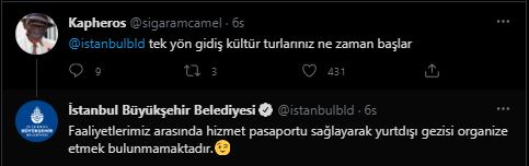 Bir Twitter kullanıcısı İBB'nin resmi hesabını etiketleyerek "Tek yön gidiş kültür turlarınız ne zaman başlar" diye sordu. İBB'nin onaylı resmi hesabından yanıt geldi. Yapılan paylaşımda, "Faaliyetlerimiz arasında hizmet pasaportu sağlayarak yurtdışı gezisi organize etmek bulunmamaktadır" ifadeleri kullanıldı
