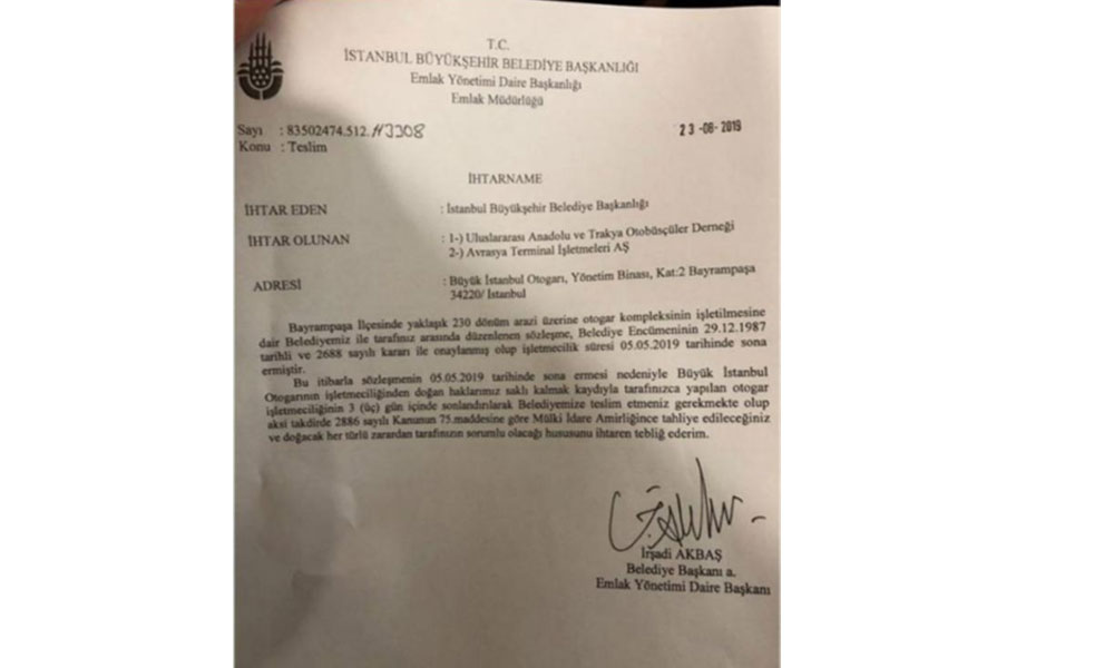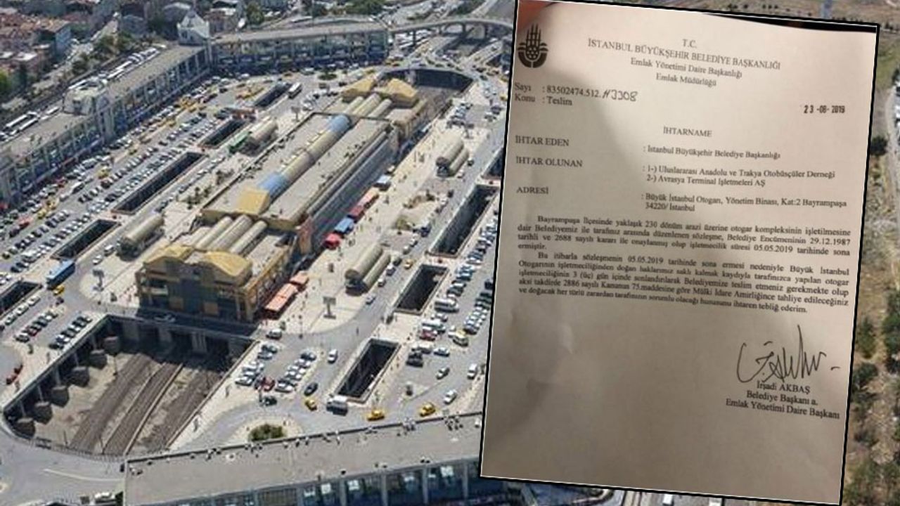 İstanbul Büyükşehir Belediyesi sözleşmesi bitmesine rağmen Bayrampaşa’daki Esenler Otogarı'nın işletmesini devretmeyen Uluslararası Anadolu ve Trakya Otobüsçüler Derneği ile Avrasya Terminal İşletmeleri A.Ş.’ye ihtarname gönderdi. Otogarın üç gün içinde boşaltılması gerekiyor.