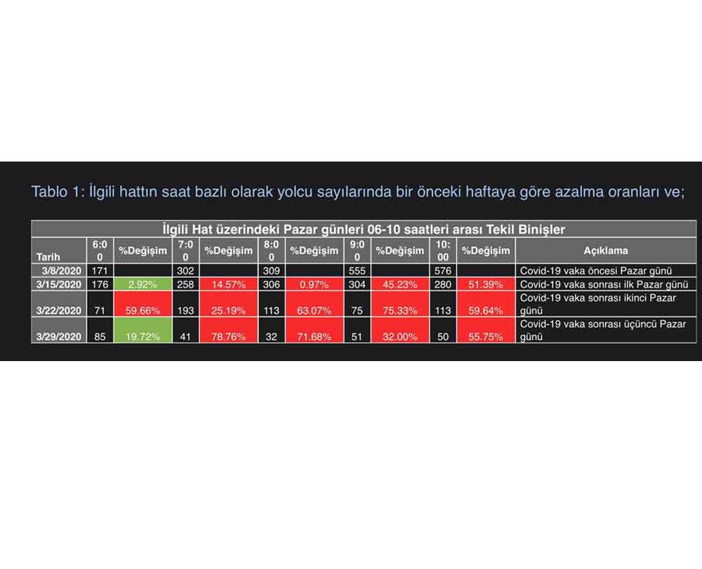 “1- 29 Mart Pazar sabahı B-1530 kapı numaralı otobüsün, tüm sabah saatleri seferlerinde bir önceki haftaya göre yüzde 56 yolcu azalması yaşanmışken, o sabah saat 06-07 arası tam aksine yüzde 19,72 yolcu artışı gözlemlendi.