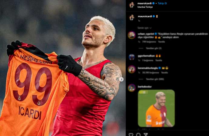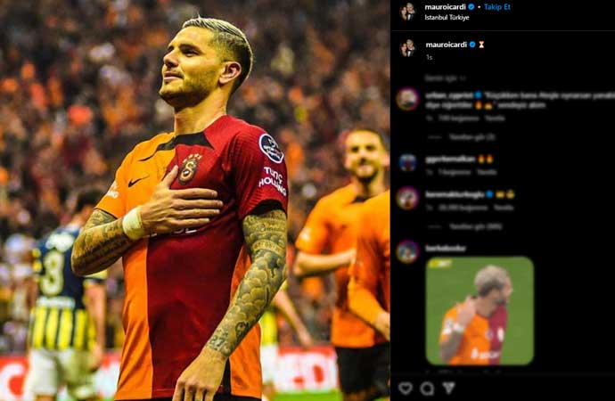Galatasaray'ın golcü oyuncusu Mauro Icardi, Fenerbahçe ile oynanacak olan derbi öncesinde geçen sezon sarı-lacivertlilere attığı gollerden sonra yaşadığı sevinçlerin fotoğraflarını paylaştı. Arjantinli yıldız, paylaşımına "Kum Saati" emojisi ekledi. Galatasaraylı taraftarlar, Icardi'nin bu paylaşımına çok sayıda yorum ve beğeni bulundu. Galatasaray'da Kerem Aktürkoğlu ise takım arkadaşı Icardi'nin paylaşımına "Taç ve güneş gözlüğü takan yüz" emojileri ile yorum yaptı.Mauro Icardi'nin paylaştığı görseller: