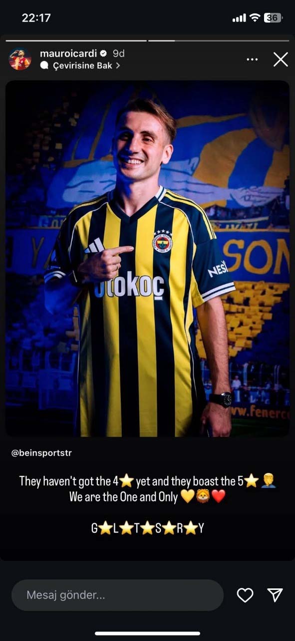 Kerem Aktürkoğlu'nun 5 yıldızlı Fenerbahçe formasıyla poz vermesini sosyal medyada paylaşan Icardi, "Daha 4 yıldızı kazanamadılar 5 yıldızla övünüyorlar" ifadelerini kullandı.