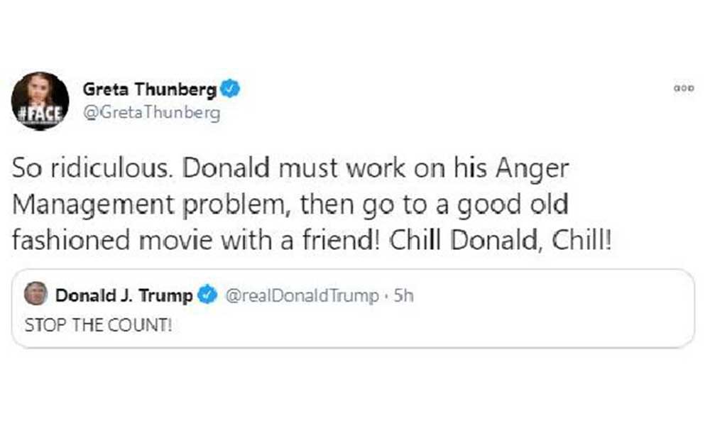 İsveçli iklim aktivisti Greta Thunberg, Twitter üzerinden ABD Başkanı ve Cumhuriyetçi adayı Donald Trump’ın “Sayımı durdurun” çağrısına “Sakinleş Donald” paylaşımında bulundu.