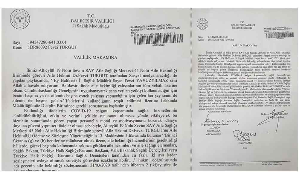 Balıkesir’de aile hekimi Fevzi Turgut, Balıkesir İl Sağlık Müdürü Fevzi Yılmaz Yavuz’un Cumhurbaşkanlığı Genelgesi’ndeki salgının yayılmasına karşı alınan esnek çalışma hükümlerine uymadığını ve genelgeyi aile hekimlerine göndermediğini sosyal medya hesabından paylaştı. Turgut, paylaşımı sonrası iki ay görevinden uzaklaştırıldı.