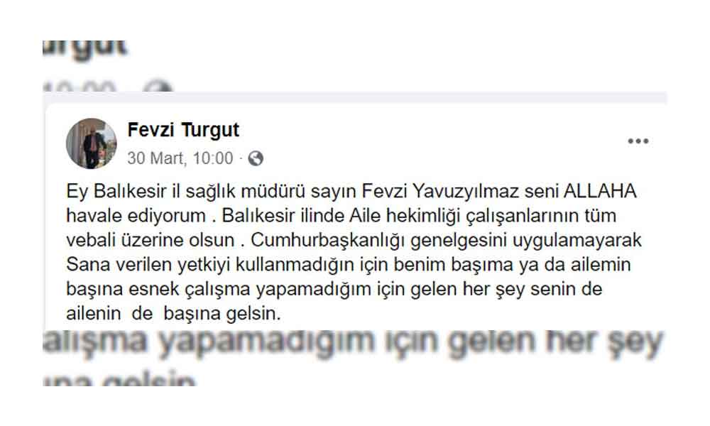 Ey Balıkesir il sağlık müdürü sayın Fevzi Yavuzyılmaz seni Allah'a havale ediyorum . Balıkesir ilinde Aile hekimliği çalışanlarının tüm vebali üzerine olsun . Cumhurbaşkanlığı genelgesini uygulamayarak Sana verilen yetkiyi kullanmadığın için benim başıma ya da ailemin başına esnek çalışma yapamadığım için gelen her şey senin de ailenin de başına gelsin.