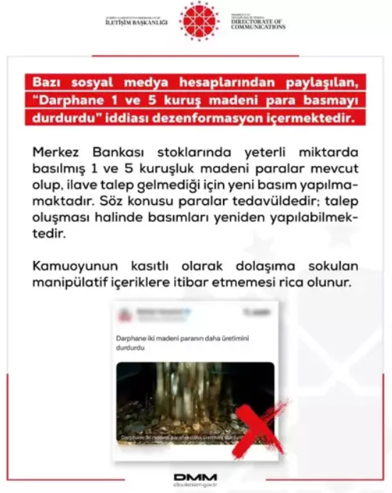 DMM'nin sanal medya hesabından yapılan yazılı açıklamada, "Bazı sosyal medya hesaplarından paylaşılan, 'Darphane 1 ve 5 kuruş madeni para basmayı durdurdu' iddiası dezenformasyon içermektedir. Merkez Bankası stoklarında yeterli miktarda basılmış 1 ve 5 kuruşluk madeni paralar mevcut olup, ilave talep gelmediği için yeni basım yapılmamaktadır. Söz konusu paralar tedavüldedir; talep oluşması halinde basımları yeniden yapılabilmektedir. Kamuoyunun kasıtlı olarak dolaşıma sokulan manipülatif içeriklere itibar etmemesi rica olunur" denildi.