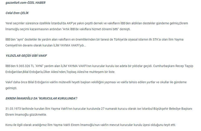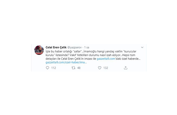 Celal Eren Çelik, Twitter hesabından, 'Ekrem İmamoğlu'nun yandaş bir vakfın kurucular kurulunda' olduğunu yazdı. 'Yandaş vakıf ve derneklere hizmet devri bitti diye inletiyordunuz' diyerek İmamoğlu'nu suçladı. Ancak işin gerçeği başkaydı. Ekrem İmamoğlu'nun Kurucular Kurulu'nda olması mümkün değildi. Çünkü Vakfın kuruluş tarihi olan 1973'te İmamoğlu dört yaşındaydı.
