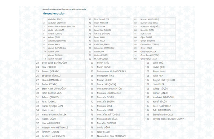 Dinci İlim Yayma Vakfı'nın "Mevcut Kurucular" listesinde AKP'li Cumhurbaşkanı Erdoğan'dan, Turgut Özal dahil birçok isim var. Aynı listede İstanbul Büyükşehir Belediye Başkanı Ekrem İmamoğlu'nun da olması kafalarda soru işaretleri yarattı. Kurucular listesinde yer alan AKP'li Cumhurbaşkanı Erdoğan'ın oğlu Bilal Erdoğan ise henüz o tarihte doğmamıştı.