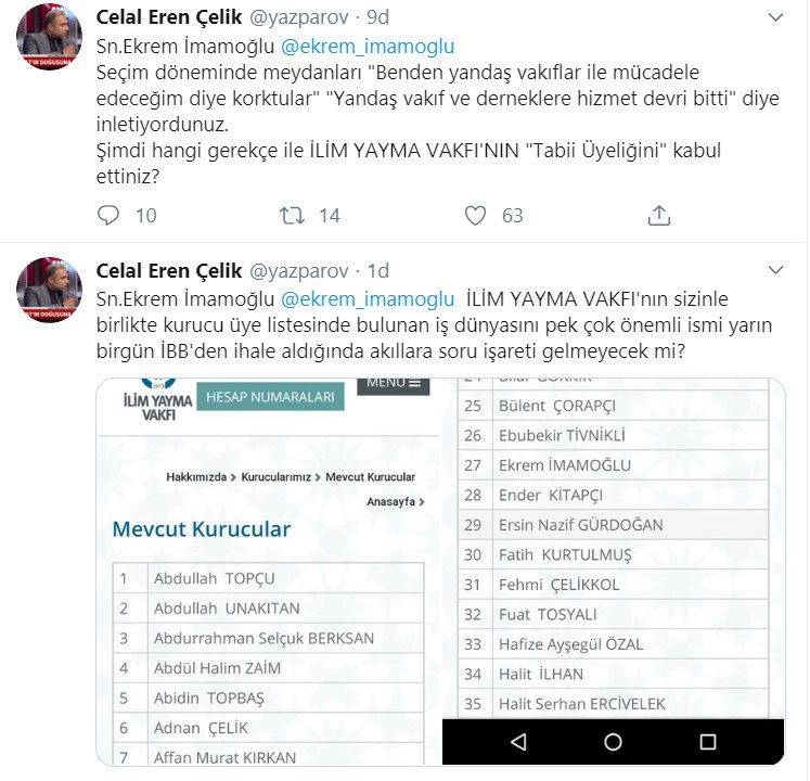 Konuyu ilk olarak gündeme getiren, Celal Eren Çelik ise, yaptığı ilk açıklamada, "İşte bu haber ortalığı "sallar"...İmamoğlu hangi yandaş vakfın "kurucular kurulu" listesinde? Vakıf Yetkilileri durumu nasıl izah ediyor...Hepsi tüm detayları ile Celal Eren Çelik'in imzası ile" derken daha sonra da İmamoğlu'nu hedef almaya devam etti. Çelik, vakfın kendi tüzüğüne göre tabii üye olan İmamoğlu için, "Kimse CHP'li bir İBB Başkanının kendi isteği ve bilgisi ile Siyasal İslam'ın en önemli STK'sı olan İLİM YAYMA VAKFI'nın kurucu üye listesine girmesini "Ne var bunda" diye normalleştirmeye çalışmasın. Bu durum normal de kabul edilebilir de değildir. İdeolojik körlük kötü şey.." diye yazdı.