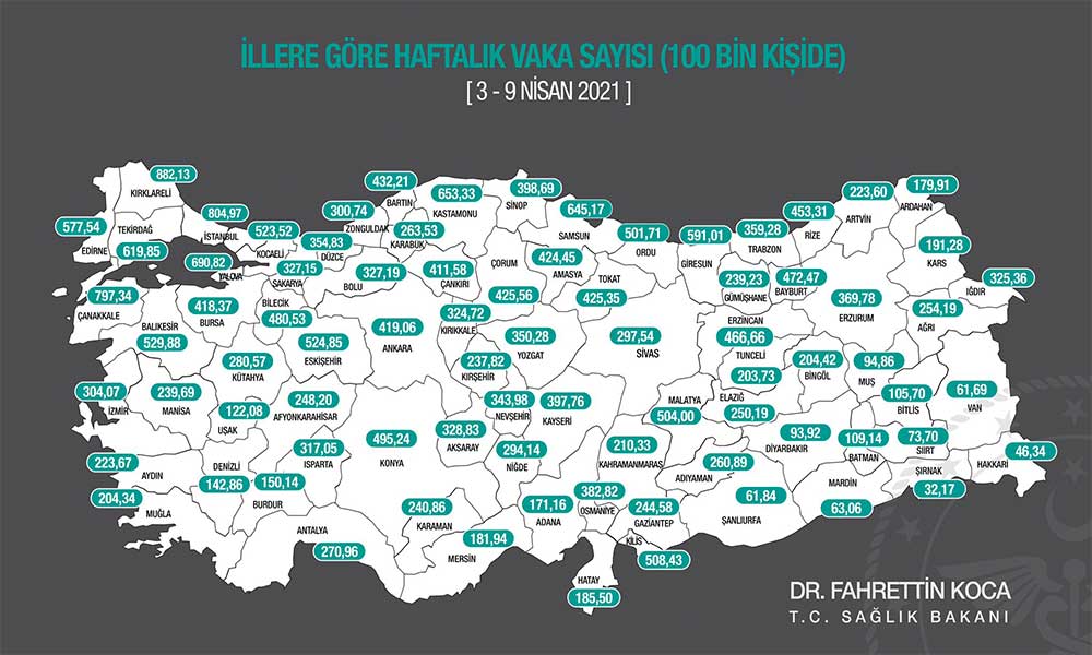 İllere göre haftalık koronavirüs vaka sayısı, her 100 bin kişide İstanbul'da 804,97, Ankara'da 419,06, İzmir'de 304,07 oldu. Haftalık verilere göre Kırklareli, İstanbul, Çanakkale, Yalova ve Samsun 100 bin kişide en çok koronavirüs vakası görülen iller oldu.