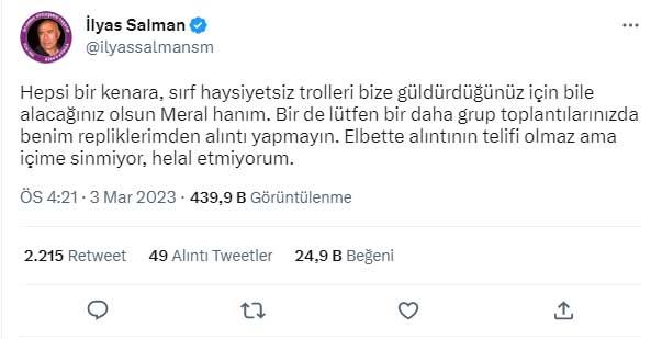 İYİ Parti Genel Başkanı Meral Akşener, Millet İttifakı'nın ortak cumhurbaşkanı adayının ele alındığı Altılı Masa toplantısının ardından, partisinin milletvekilleri ve başkanlık divanı üyeleriyle görüştü. Akşener toplantı sonrası sert ifadeler kullandı. Akşener, "Bu masa artık potansiyel adayların tartışılabildiği ortak akıldan çıkmış" dedi. Akşener, masaya aday olarak Yavaş ve İmamoğlu'nun ismini sunduklarını belirtti. Akşener'in açıklaması sonrası İlyas Salman, kendi kişisel twitter hesabından yaptığı paylaşımla Akşener'e sert tepki gösterdi. https://tele1.com.tr/aksener-masadan-kalkti-798641/ Salman, paylaşımında şunları ifade etti: "Hepsi bir kenara, sırf haysiyetsiz trolleri bize güldürdüğünüz için bile alacağınız olsun Meral hanım. Bir de lütfen bir daha grup toplantılarınızda benim repliklerimden alıntı yapmayın. Elbette alıntının telifi olmaz ama içime sinmiyor, helal etmiyorum."