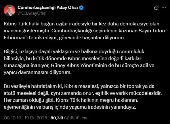 "Kıbrıs Türk halkı bugün özgür iradesiyle bir kez daha demokrasiye olan inancını göstermiştir. Cumhurbaşkanlığı seçimlerini kazanan Sayın Tufan Erhürman’ı tebrik ediyor, görevinde başarılar diliyorum.