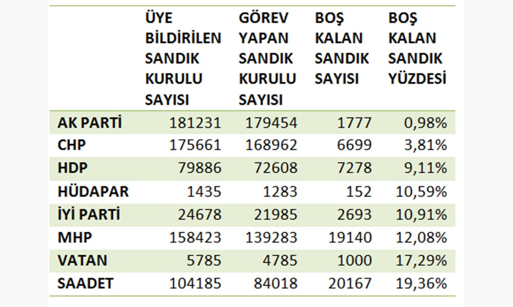 CHP'nin olmadığı yerlerde ittifak üyelerinin olduğunu sonuçlara göre, partilerin boş kalan sandıklarının yüzdeleri hesaplandığında CHP AKP'den hemen sonra 2. sırada yer aldı. AKP yüzde 0,98 en az boş sandık bırakan parti olurken, CHP yüzde 3,81 ile 2. parti oldu.