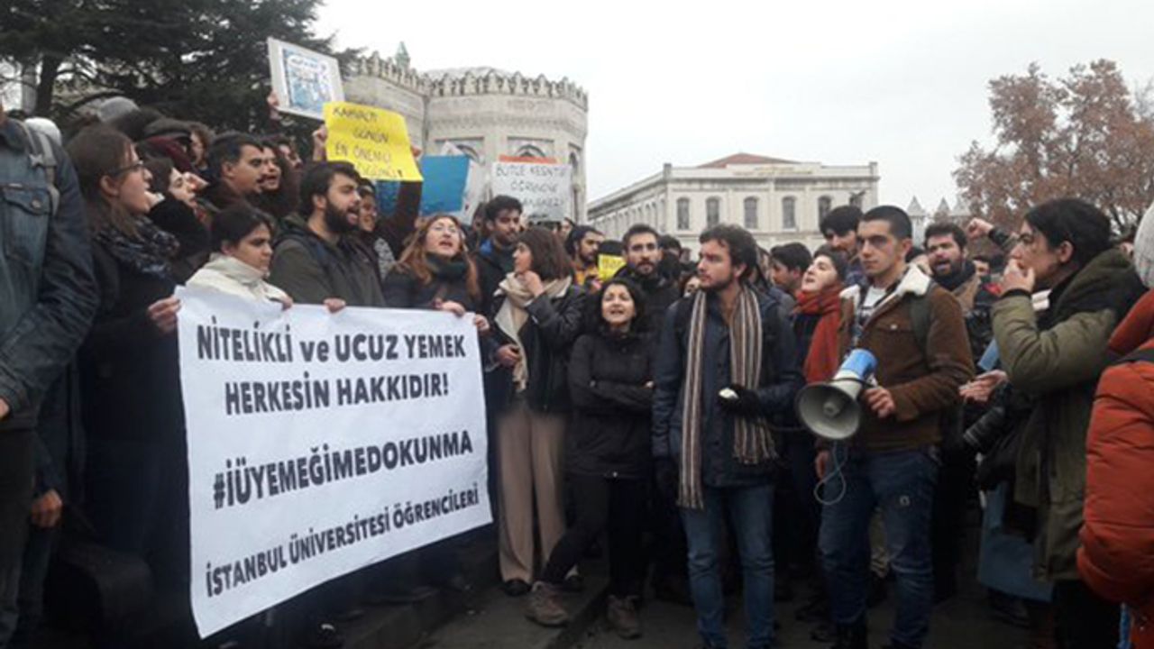 İstanbul Üniversitesi yemekhanesinde geçtiğimiz yıllarda yapılan zamların ardından, indirimli yemek ücretinin de tek öğüne indirilmesine karşı çıkan üniversite öğrencileri Beyazıt Anakapı önünde eylem yaptı.