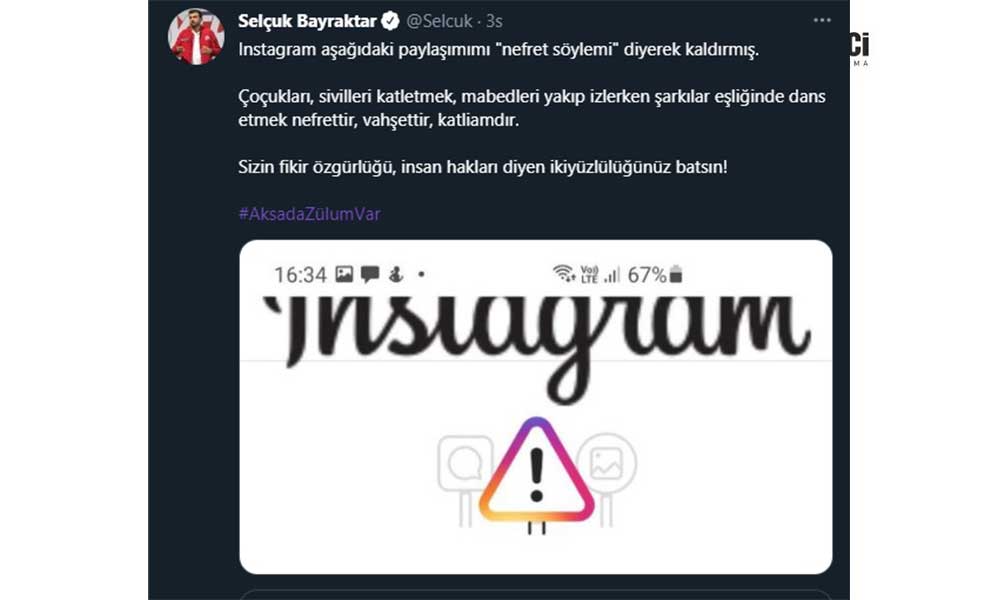 Twitter hesabından açıklama yapan Selçuk Bayrakytar, ''Instagram aşağıdaki paylaşımımı "nefret söylemi" diyerek kaldırmış. https://tele1.com.tr/merdan-yanardagdan-selcuk-bayraktara-yanit-sihalarinizla-tele1i-mi-vuracaksiniz-253130/ Çoçukları, sivilleri katletmek, mabedleri yakıp izlerken şarkılar eşliğinde dans etmek nefrettir, vahşettir, katliamdır. Sizin fikir özgürlüğü, insan hakları diyen ikiyüzlülüğünüz batsın!'' ifadelerini kullandı.
