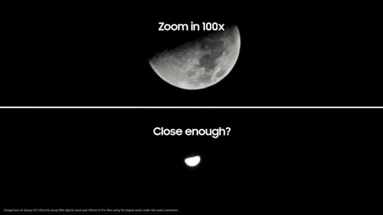 Samsung’un yeni can alıcı noktası, “Telefon yükseltmenizin eski sürüme geçirilmemesi gerektiği” idi ve şirket bunu reklamlarda açıkça sergiledi. İlk reklam, bir peynirli sandviçi yakaladıkları bir sahnedeki iki cihazı karşılaştırıyor. Burada Galaxy S21 Ultra, daha yüksek 108 megapiksel çözünürlüklü sensörü sayesinde iPhone 12 Pro Max’e kıyasla çok daha yüksek ayrıntı derecesini koruyor. İkinci reklam, bir yakınlaştırma testi olduğu için Apple iPhone’u aşağılamada daha da ileri gidiyor.