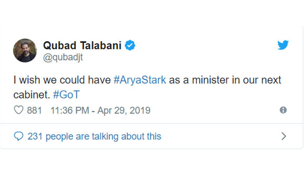 Barzani’ye yakın Rudaw’ın haberine göre; Başbakan Yardımcısı Talabani Twiter hesabından, “Keşke Arya Stark’i bir sonraki kabinemizde Bakan yapabilseydik” paylaşımında bulundu.