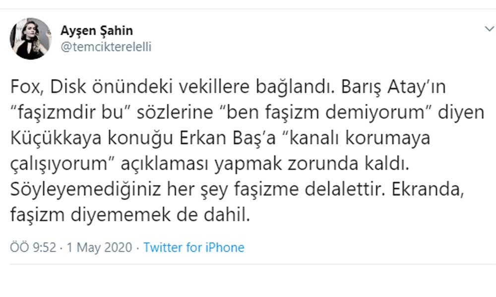 DİSK Genel Başkanı Arzu A. Çerkezoğlu’nun da aralarında bulunduğu 25 sendikacı gözaltına alındı. DİSK Genel Başkanı Arzu Çerkezoğlu gözaltına alındı DİSK’in Beşiktaş’taki binası önünde yer alan TİP milletvekili Barış Atay ve Erkan Baş, İsmail Küçükkaya’nın FOX TV’deki Çalar Saat programına bağlandı. Yaşanan gözaltı ve ablukayla ilgili konuşan Barış Atay’ın “faşizmdir bu” sözlerine “ben faşizm demiyorum” diyen Küçükkaya konuğu Erkan Baş’a “kanalı korumaya çalışıyorum” açıklaması yaptı. Fatih Portakal’a Bankacılık Kanunu’nu ihlalden 3 yıla kadar hapis istemi Küçükkaya’nın bu açıklaması tepkilere neden oldu. https://tele1.com.tr/erkan-bas-asil-kamu-duzenini-bozanlar-isciyi-39-liraya-mahkum-edenlerdir-158686/