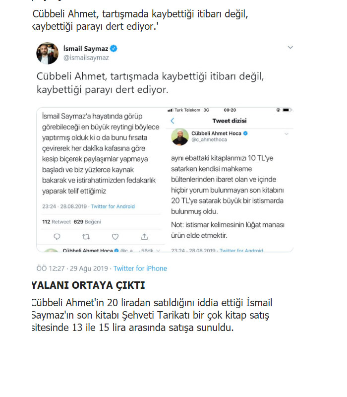 Not: istismar kelimesinin lüğat manası ürün elde etmektir.' dedi. Cübbeli Ahmet sosyal medya hesabından yaptığı paylaşımda 'İsmail Saymaz'a hayatında görüp görebileceği en büyük reytingi böylece yaptırmış olduk ki o da bunu fırsata çevirerek her dakîka kafasına göre kesip biçerek paylaşımlar yapmaya başladı ve biz yüzlerce kaynak bakarak ve istirahatimizden fedakarlık yaparak telif ettiğimiz aynı ebattaki kitaplarımızı 10 TL'ye satarken kendisi mahkeme bültenlerinden ibaret olan ve içinde hiçbir yorum bulunmayan son kitabını 20 TL'ye satarak büyük bir istismarda bulunmuş oldu.'BANA MÜSAADE CANIM ŞEKERİM FIRLADI'