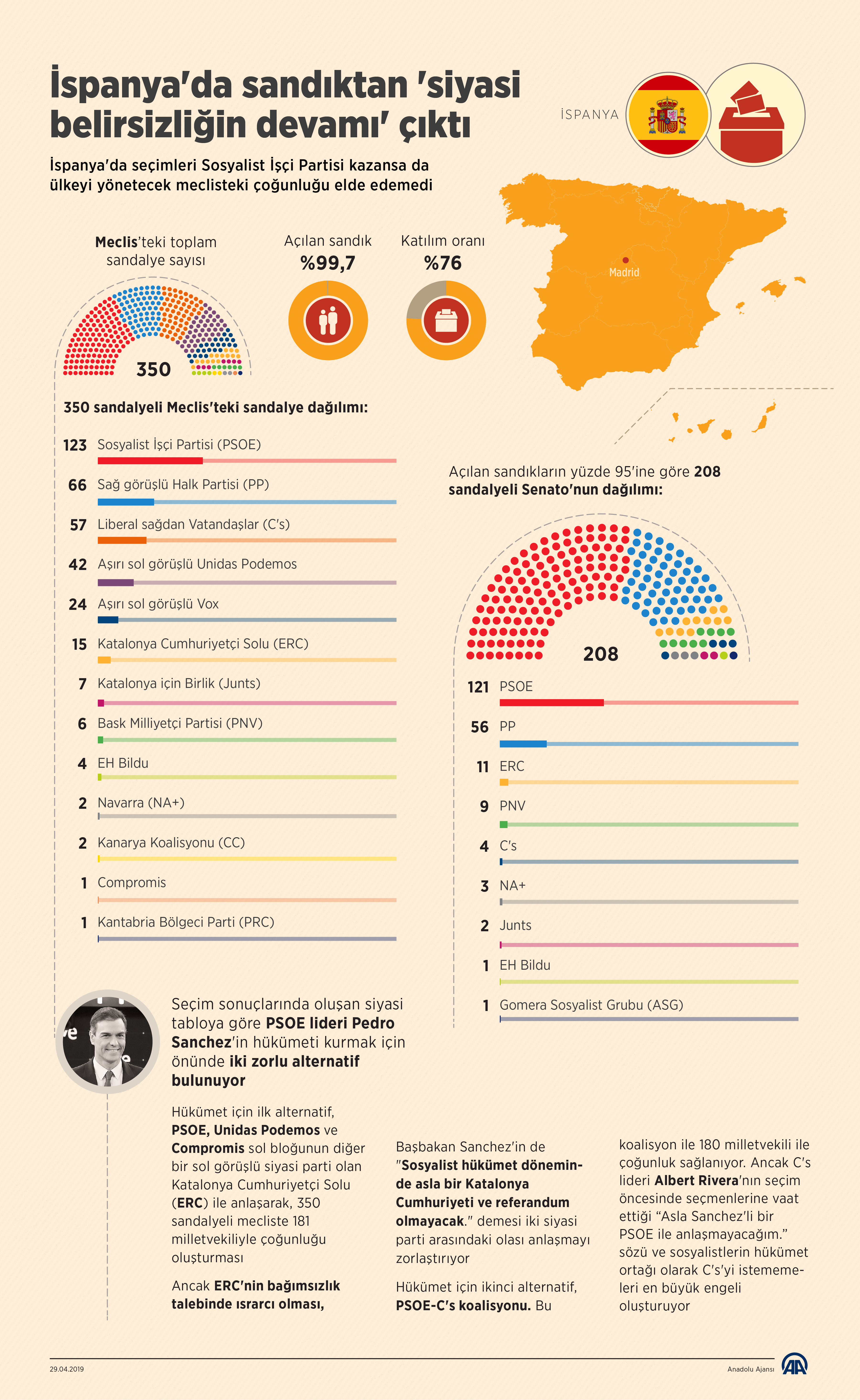 PSOE, parlamentoda 123 sandalyeyi kazanmasına rağmen yine de sandalye sayısı 350 olan parlamentoda çoğunluğu elde edemedi. Dolayısıyla partinin bir önceki hükümette ortaklardan biri olan ve bu seçimde 42 sandalye kazanan merkez sol parti Podemos ya da özerk bölgelerden çıkan siyasi partilerin desteğine ihtiyacı olacak. Podemos’un lideri Pablo Iglesias, oy verme işleminin tamamlanmasının ardından yaptığı açıklamada, yeni bir koalisyonun mümkün olabileceğini duyurdu.