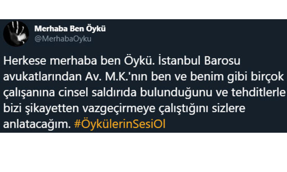 Stajyer avukat sosyal medyada, “Herkese merhaba ben Öykü. İstanbul Barosu avukatlarından Av. M.K.'nın ben ve benim gibi birçok çalışanına cinsel saldırıda bulunduğunu ve tehditlerle bizi şikayetten vazgeçirmeye çalıştığını sizlere anlatacağım” yazılı bir mesaj paylaştı. Kısa sürede yayılan mesaj sonrası İstanbul Barosu harekete geçti.