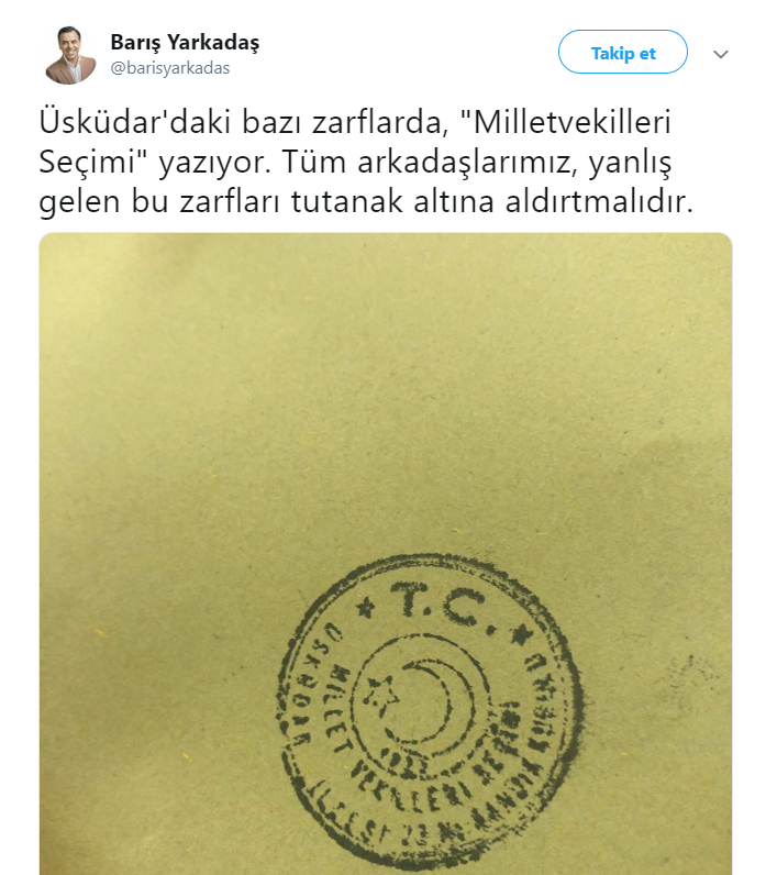 Eski CHP Milletvekili ve gazeteci Barış Yarkadaş, İstanbul Üsküdar'daki bazı zarflar için uyarıda bulunmuştu Yarkadaş, "Üsküdar'daki bazı zarflarda, "Milletvekilleri Seçimi" yazıyor. Tüm arkadaşlarımız, yanlış gelen bu zarfları tutanak altına aldırtmalıdır." ifadelerini kullanmıştı. Konuyla ilgili sorun Beykoz ilçe seçim kurulunun kararıyla çözüldü
