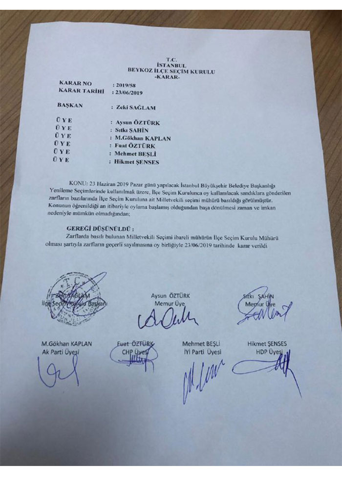 Eski CHP Milletvekili ve Gazeteci Barış Yarkadaş kendisine ait sosyal meyda hesabından bazı sandıklarda kullanılan zarfların sütünde 'Miiletvekili seçimi'' yazdığını aktarmıştı. Beykoz İlçe Seçim Kurulu söz konusu zarfların geçerli sayılmasına karar verdi. https://tele1.com.tr/akpnin-bitmeyen-secim-plani-akp-aleyhine-hata-yapildigini-gosteren-tutanak-imzalatilmaya-calisiyorlar-62963/ Beykoz İlçe Seçim Kurulu aldığı kararda '' Zarflarda basılı bulunan 'Milletvekili Seçimi'' ibareli mührün ilçe seçim kurulu mührü olması şartıyla zarfların geçerli sayılmasına oy birliği ile 23/09/2019 tarihinde karar verildi'' ifadeleri kullanıldı. https://tele1.com.tr/fatih-altaylidan-23-haziran-yazisi-kimse-kusura-bakmasin-bu-sefer-62957/