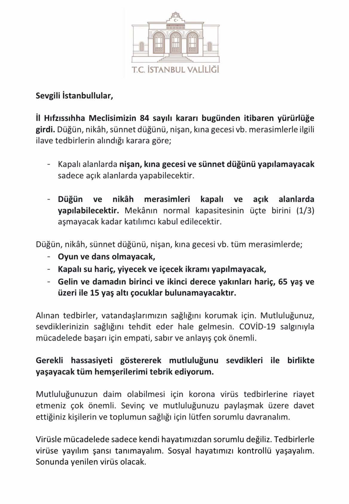 İstanbul Valisi Ali Yerlikaya, sosyal medya hesabından yaptığı paylaşımla, koronavirüs tedbirleri kapsamında İstanbul'da, düğün, nikah, sünnet, nişan, kına gecesi gibi merasimlerde alınan yeni önlemleri içeren İl Hıfzıssıhha Meclisinin 84 sayılı kararının yürürlüğe girdiğini açıkladı. Yerlikaya, "Sevgili İstanbullular, İl Hıfzıssıhha Meclisimizin 84 sayılı kararı yürürlüğe girdi. Düğün, nikâh, sünnet, nişan, kına gecesi v.b. merasimlerle ilgili ilave tedbirler, mutluluğu yaşarken virüsü de mutlu etmemek, hastalığın yayılımını engellemek için alındı" ifadelerini kullandı.Yerlikaya'nın paylaştığı kurallar şöyle: