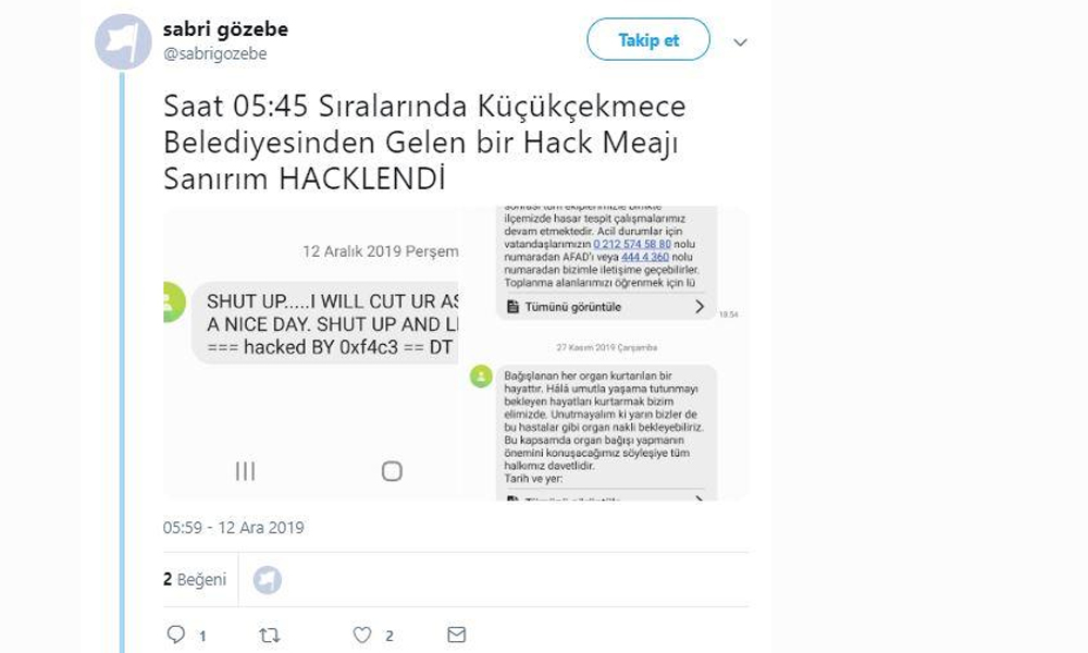 Küçükçekmece Belediyesi'nden ilçe sakinlerine sabaha karşı giden İngilizce küfürlü mesaj sonrası SMS sisteminin hacklendiği anlaşıldı. Küfürlü mesajların ardından Küçükçekmece Belediyesi bir açıklama yayımlayarak "Kurumumuzun dışarıdan aldığı SMS sistemiyle ilgili bir olumsuzluk olmuştur" dedi. Vatandaşlar belediyeye kişisel verilerin paylaşılmasına yönelik endişelerini iletti. İstanbul Küçükçekmece'de yaşayanlar sabaha karşı belediyeden gelen İngilizce küfürlü bir mesaj aldı. Sabaha karşı 05.41 ile 05.48 aralığında yollanan mesaj sosyal medyanın en çok konuşulanları arasına girdi.